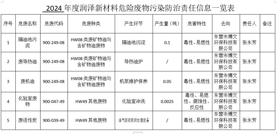 2024 年度潤澤新材料危險(xiǎn)廢物污染防治責(zé)任信息一覽表
